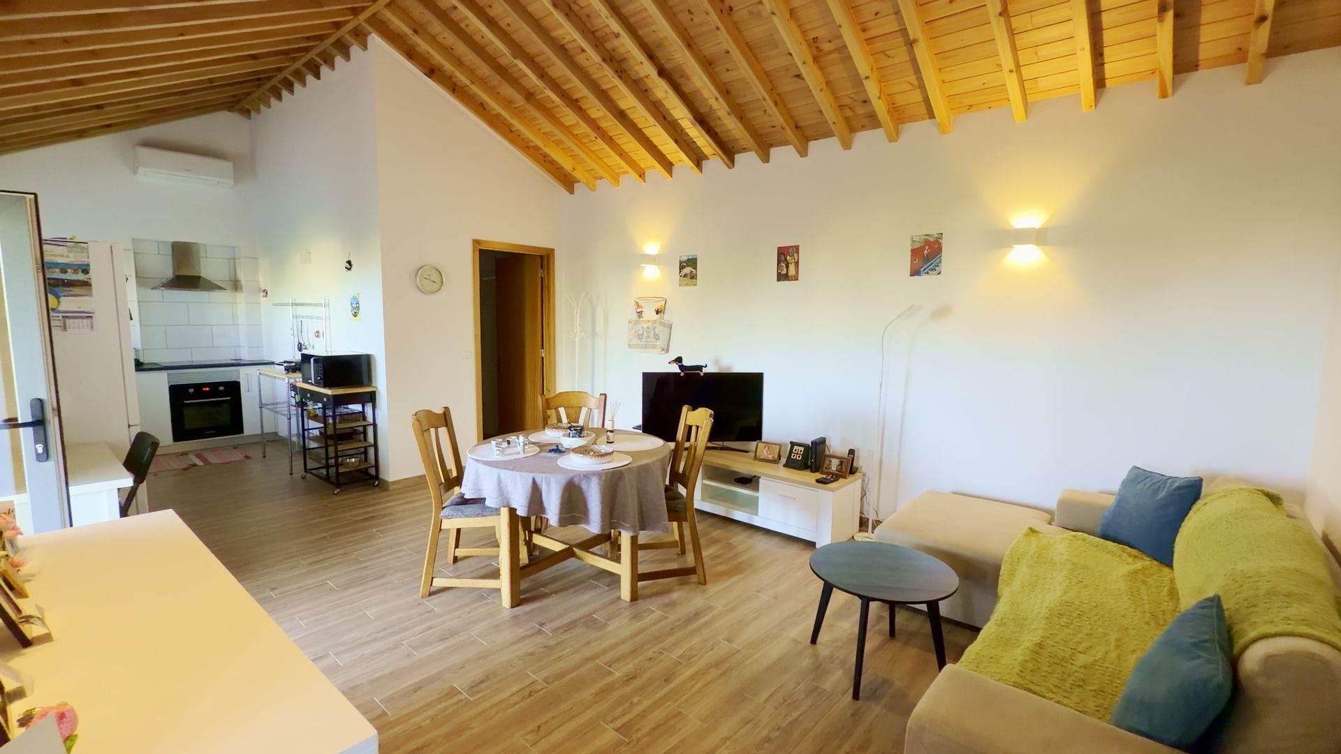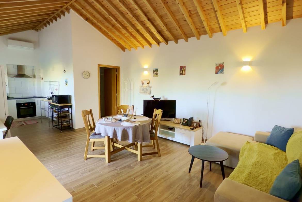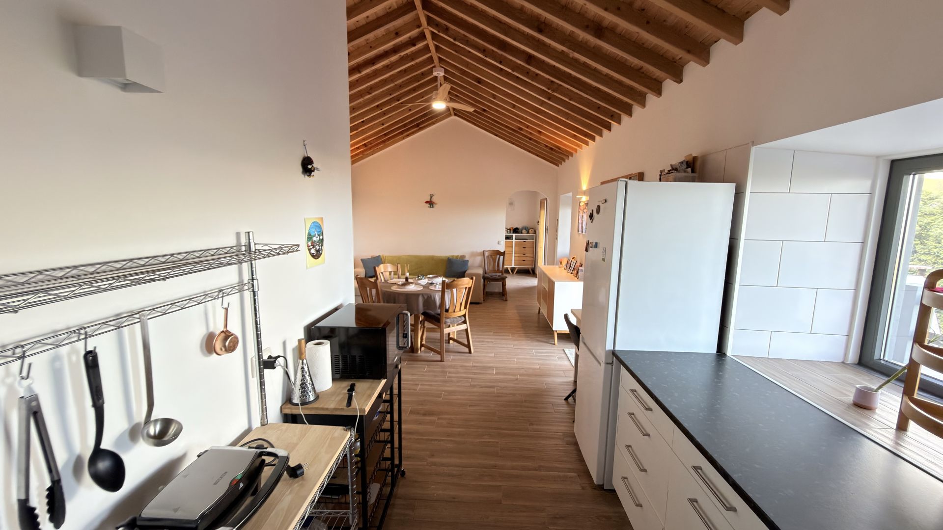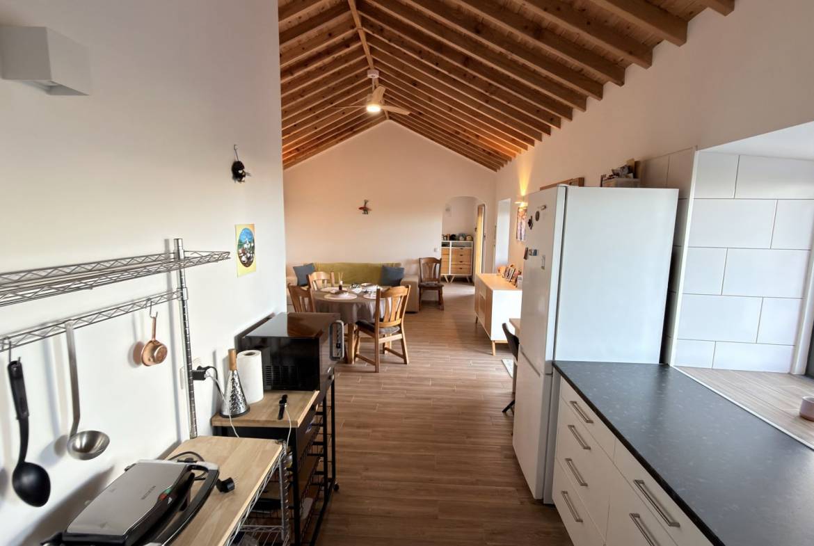 - Vida moderna em plano aberto: Uma cozinha e uma sala de estar luminosas e arejadas com tectos abobadados em madeira, perfeitas para receber ou relaxar.