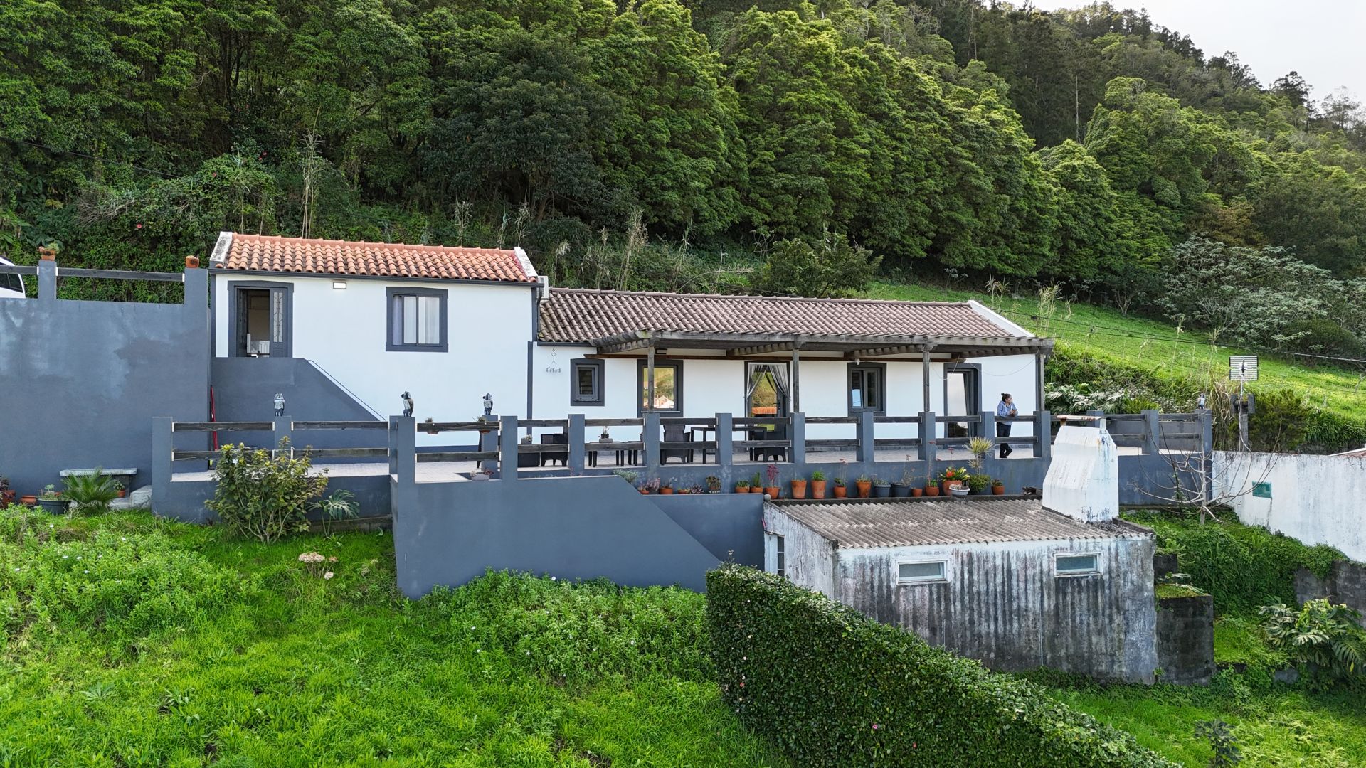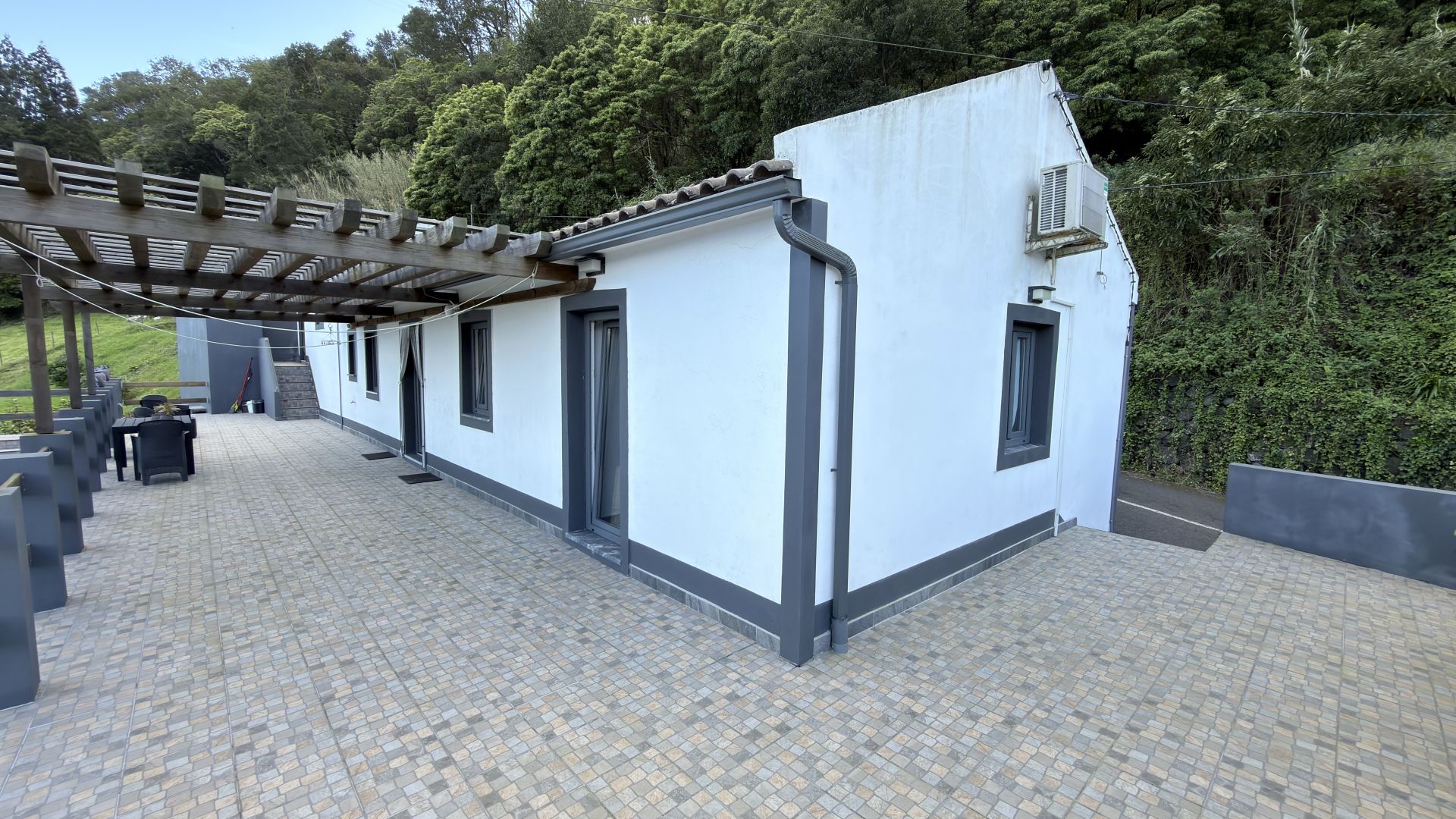 - Azulejos exteriores actualizados e uma bela pérgola de madeira no terraço.